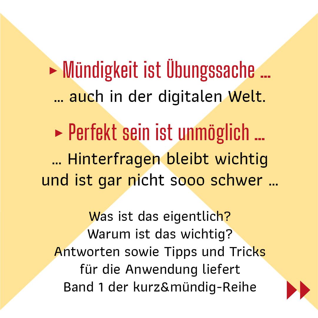 „Ich kann nicht alles wissen, aber ich möchte wissen, wovon ich keine Ahnung habe.“ Dabei hilft der Band „Digitale Mündigkeit“ der Reihe kurz&mündig. Kurz und prägnant erklärt Leena Simon abstrakte Konzepte wie Algorithmen oder Datenschutz und bietet konkrete Handlungsansätze für den Alltag.